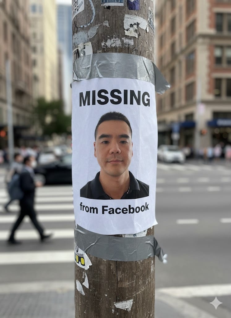“A humorous street poster taped to a wooden utility pole in a busy city crosswalk. The poster features a young Asian man from the uploaded photo (face recognition: true). His outfit, expression, and pose should match the uploaded image naturally. The poster design includes bold black text on white paper reading: “MISSING” at the top and “from Facebook” at the bottom. The paper appears slightly wrinkled and attached to the pole with silver duct tape. The background shows an urban street with pedestrians, passing cars, and buildings under daylight. Style: ultra-realistic, candid photography, natural lighting, urban setting, humorous tone, shallow depth of field, crisp details, documentary-style composition.”