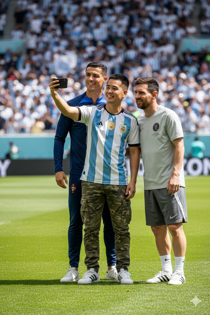 Step 3: Type this prompt "Photorealistic 4k image of standing on a bright, green football pitch, taking a close selfie with Cristiano Ronaldo and Lionel Messi. He is holding up a smartphone with one hand, smiling naturally. He is wearing a Argentina FC shirt, He is wearing a camouflage pants and white shoe of Adidas. Cristiano Ronaldo and Lionel Messi stand close on either side of him, smiling casually into the camera like friends posing for a fun picture. The stadium in the background is filled with cheering fans, blurred slightly to keep focus on the selfie group. Bright daylight, realistic details, crisp shadows, and vibrant. Note: use facial description from the uploaded image with body details."