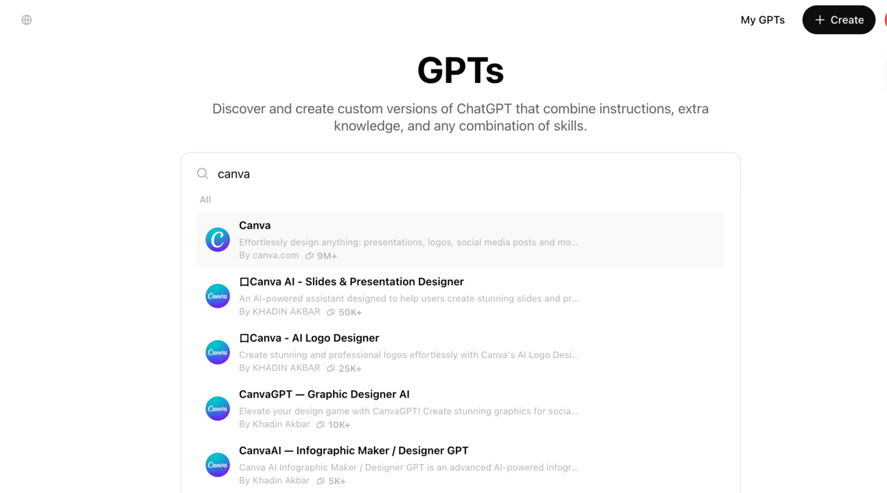 → Search for "Canva" and click this link https://chatgpt.com/g/g-alKfVrz9K-canva
