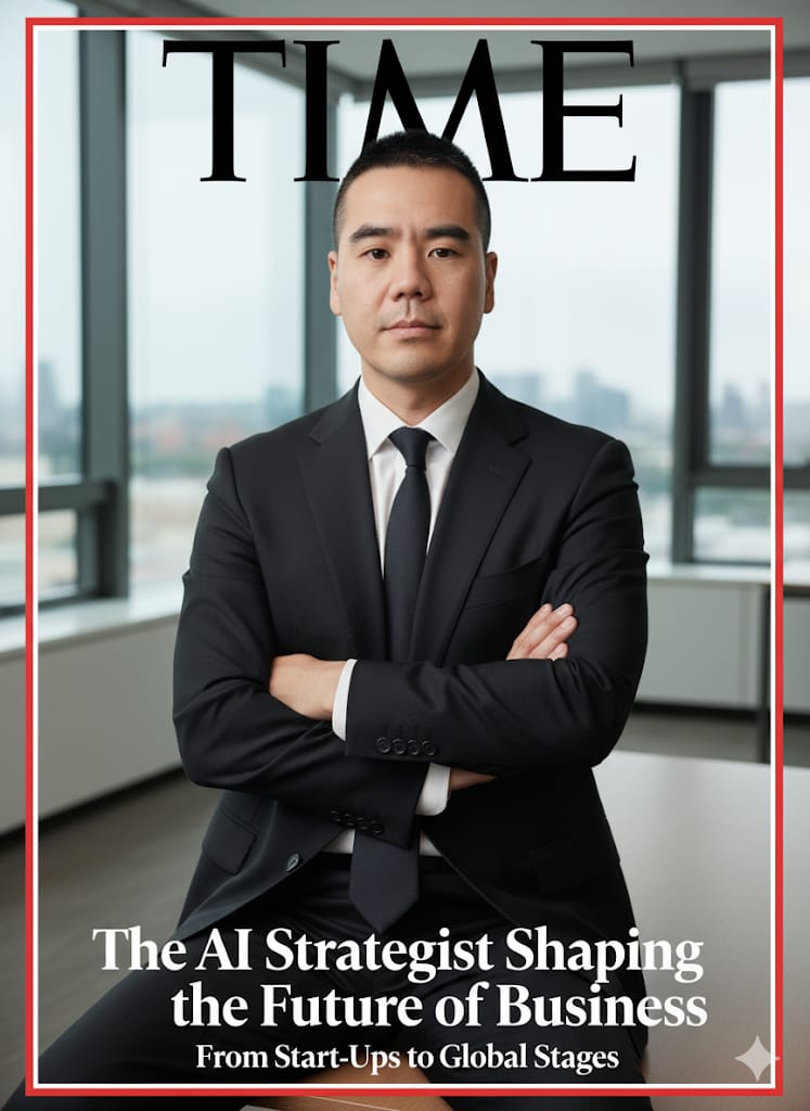“Create a magazine cover in the style of TIME using the uploaded image. Apply a CRITICAL IDENTITY LOCK to preserve the subject’s exact facial structure, hairstyle, skin tone, body proportions, age, and expression. The subject is wearing a black suit, sitting with arms crossed, posed confidently and professionally.