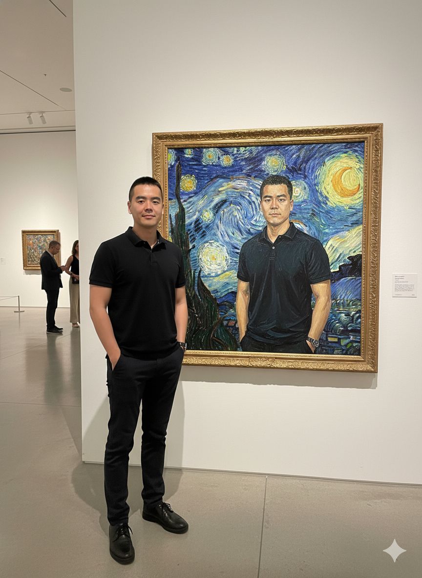 “Create an image of me standing next to a large framed painting of myself. Use the uploaded photo for my face, body, hair and overall look. The painting must match me exactly in likeness. Make the artwork look like it was painted in the style of Vincent van Gogh’s “The Starry Night”, with bold brush strokes, strong colours and a swirling background. Set the scene in an art gallery with soft lighting. My pose should look confident and natural beside the painting. The painting should be slightly taller than me. Match my outfit from the uploaded photo unless I upload a new one. Keep the final image clean, sharp and cinematic.”