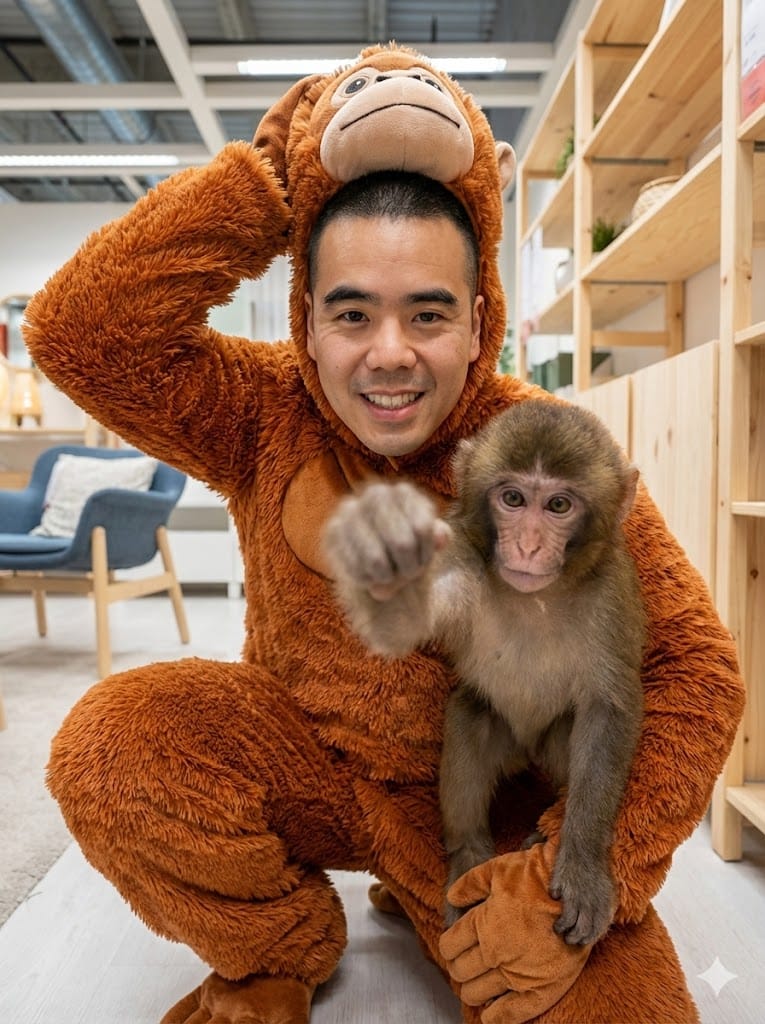 The reference person is wearing the iconic IKEA-style orangutan costume. Plush orange-brown synthetic fur, slightly oversized proportions, long dangling orangutan arms, soft padded hands and feet. The mascot head is pushed slightly back, naturally resting behind the real head, so the reference person’s clean-shaven face is clearly visible within the opening.
