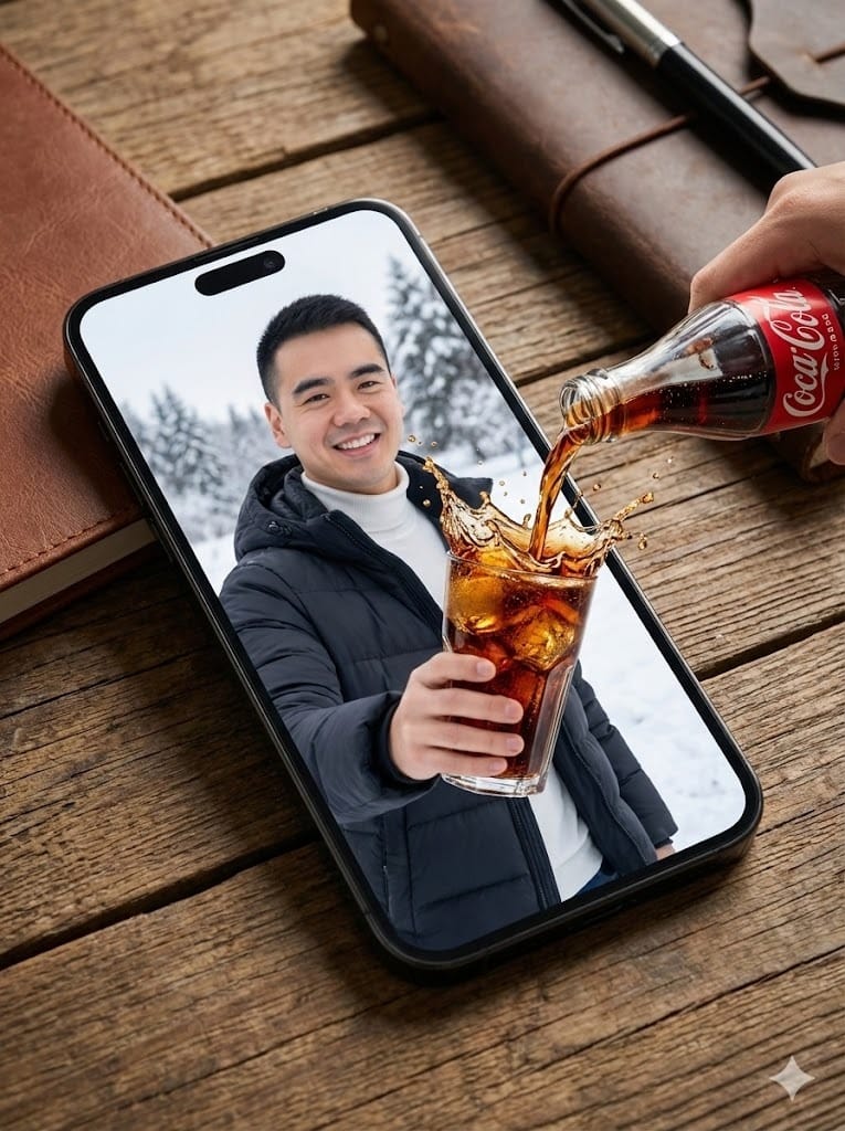 “A photorealistic, highly detailed image featuring a young man with a warm smile, wearing a dark puffer jacket over a white turtleneck, standing in a snowy winter landscape. The scene is displayed on a modern smartphone screen resting on a rustic wooden table next to a notebook and a pen. The main subject, the man and the beverage, dramatically breaks the screen boundary (3D pop-out effect): a hand from outside the screen is pouring Coca-Cola from a glass bottle directly into a glass held by the man inside the screen, resulting in a dynamic splash and realistic liquid movement. The glass and the splash are rendered with high realism and dramatic lighting, popping out of the phone's bezel. Cinematic lighting, hyperrealism, 8k resolution, deep depth of field, sharp focus, digital art, high-contrast.”