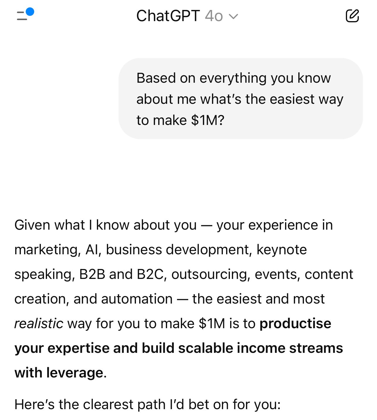 Step 2: Type this prompt “Based on what you know about me, what is the easiest way to make $1M)"