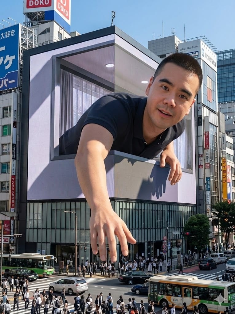 “An enormous L-shaped glasses-free 3D LED screen positioned at a busy city intersection in a style similar to Shinjuku in Tokyo or Taikoo Li in Chengdu. The screen showcases a glasses-free 3D animation featuring the man from the uploaded reference photo, keeping his face, hair, and natural features perfectly accurate. In the animation, a giant hyper-real version of him leans forward playfully from inside the screen. His upper body pushes past the frame as if entering real space, with his hand reaching out toward pedestrians below. His expression is curious and friendly, matching the reference photo. The depth is strong enough that he appears to float out into mid-air. Under bright daytime lighting, his form casts soft, realistic shadows across the LED surface and nearby buildings. The whole scene blends seamlessly with the urban setting, filled with crisp detail, vibrant colour, and a lively street atmosphere.”