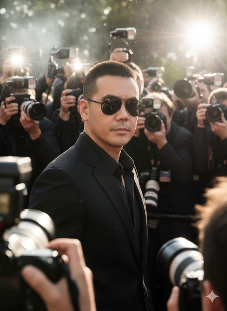āCreate an ultra-realistic cinematic portrait of the uploaded man. Apply a CRITICAL IDENTITY LOCK to preserve his exact facial features, hairstyle, skin tone, body proportions, age, and expression with complete accuracy. He is styled as a world-class celebrity in a candid paparazzi moment. He wears a sharp black suit with dark shades, exuding authority and elegance. Multiple camera flashes burst around him, creating a chaotic yet glamorous atmosphere of attention. The composition shows him surrounded by a crowd of photographers, with some cameras and flashes appearing in the foreground for realism. Daylight strikes from the side, adding dramatic contrast and a red-carpet feel. His posture is confident, his presence magnetic, capturing the look of someone who dominates the spotlight.ā