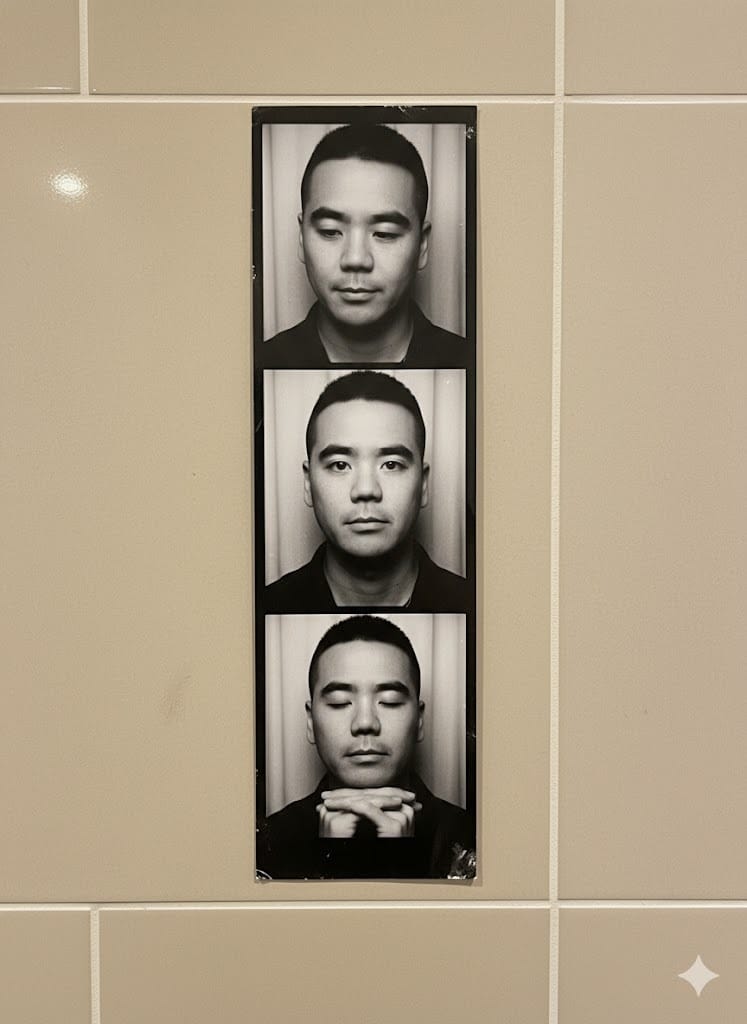 āA single vertical photostrip with four striking black-and-white frames adheres flat against a warm beige glossy ceramic tiled wall, the grout lines crisply visible. Each portrait captures the same subject [Person in the image], shifting through quiet introspection as subject gazes down to the left, a spontaneous smile lifting softly upward and left, an intense, direct serious stare, then peaceful serenity as Subject's eyes close and hands rest beneath subject's chin. The neutral photobooth curtain texture is suggested by subtle fabric folds softly visible behind subject in every frame. Gentle diffuse lighting washes the strip, enhancing rich midtones and analog grain characteristic of classic film, while the tile's slight gloss is diffused into soft highlights. The photostrip rests centered and flat, bearing gentle creases and faint fingerprints, as shadows and subtle flash reflections lend casual authenticity from a gently skewed overhead iPhone snapshot. The minimalist composition and tender tonal contrast evoke intimate nostalgia and emotional depth contemporary photobooth snapshot, shot on iPhone. [DO NOT CHANGE SUBJECT'S FACIAL FEATURES]ā