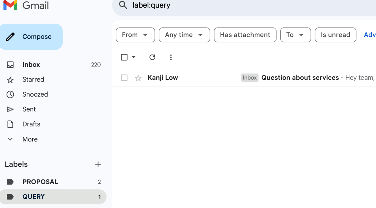 “You are to read this incoming email and put a label on it, choose between: ‘QUERY’ = a question that is being asked ‘PROPOSAL’ someone is offered some thing